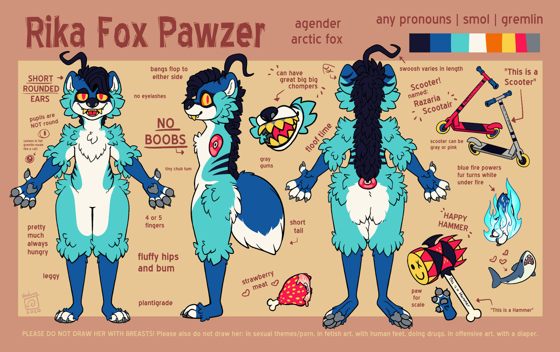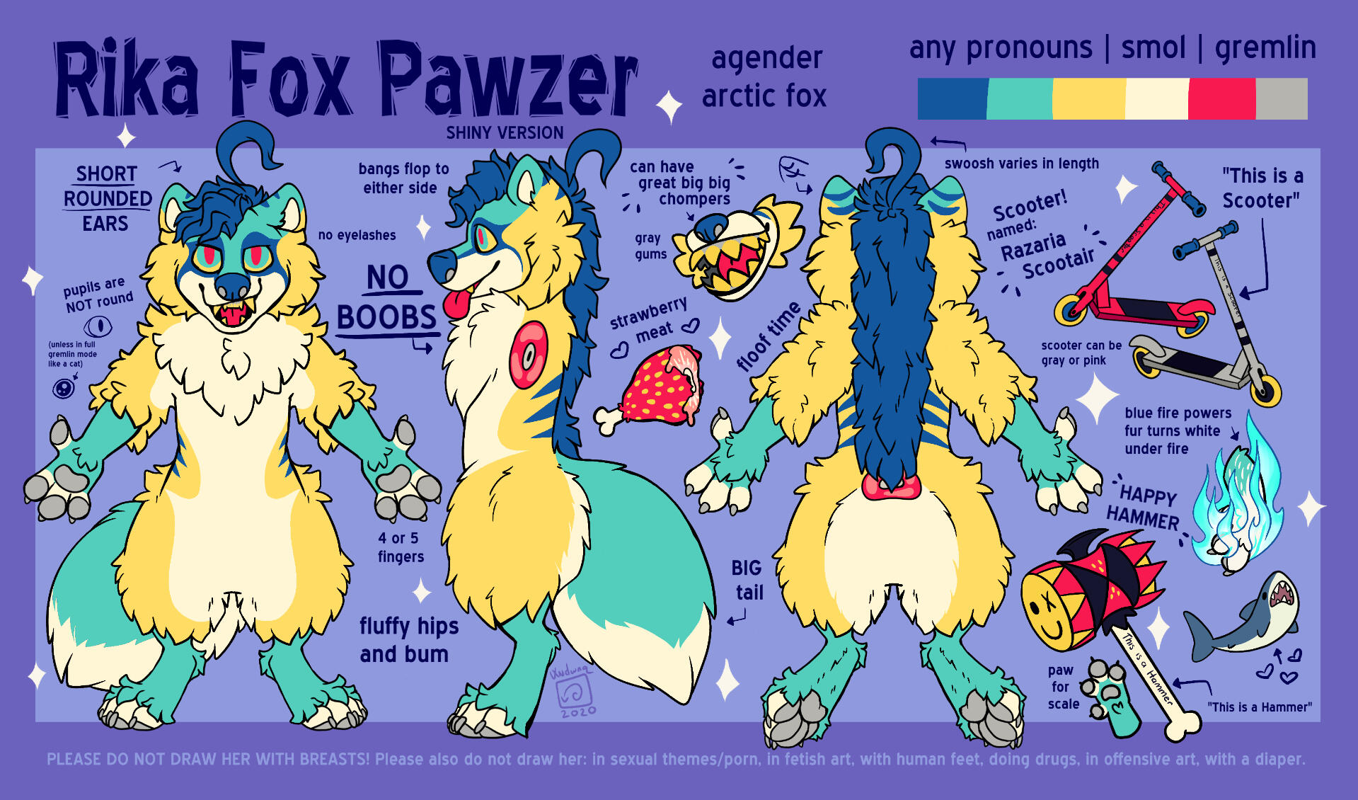 Drawing Dos: Please do draw her with her scooter/hammer/blue fire/strawberries/strawberry meat, with friends, punching bigots, in gore/candy gore art (within reason).