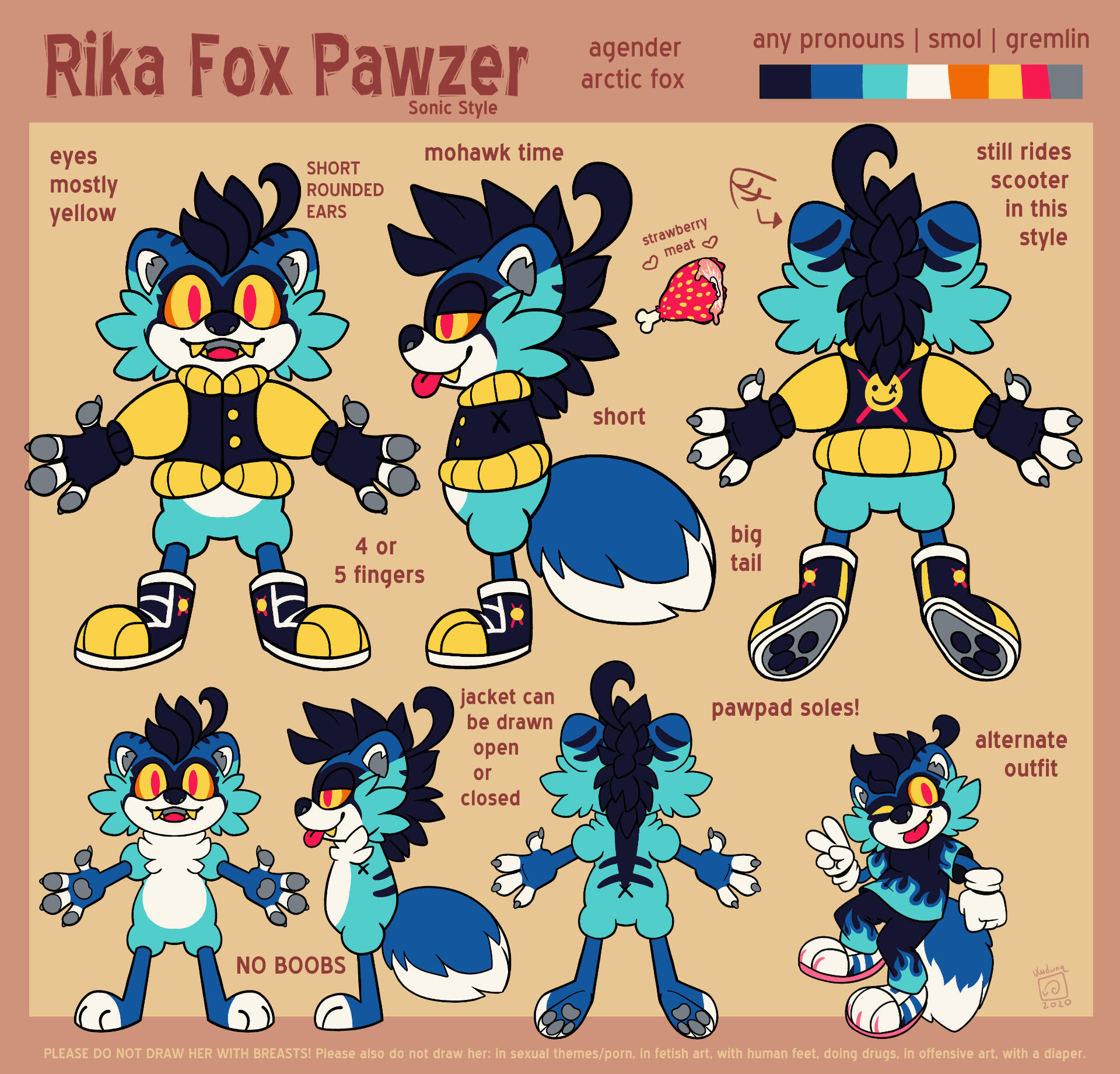 Rika came into this world as a Sonic fan OC, so she will never escape that fate. Toony Rika (aka Sonic style or Mobius Rika) is a call back to her OG looks, which there were many of even back then. She just can't choose one. Always complicated. Toony Rika is special however, as there is much room for artistic freedom! This may be her official Sonic style look, but it is also a guideline for a simpler version of Rika for those with really toony or simple art styles!