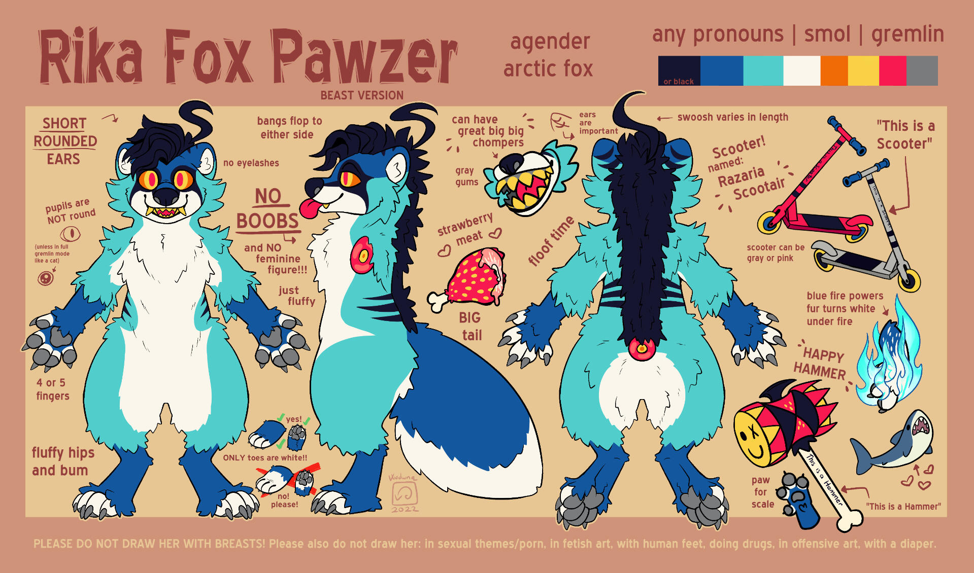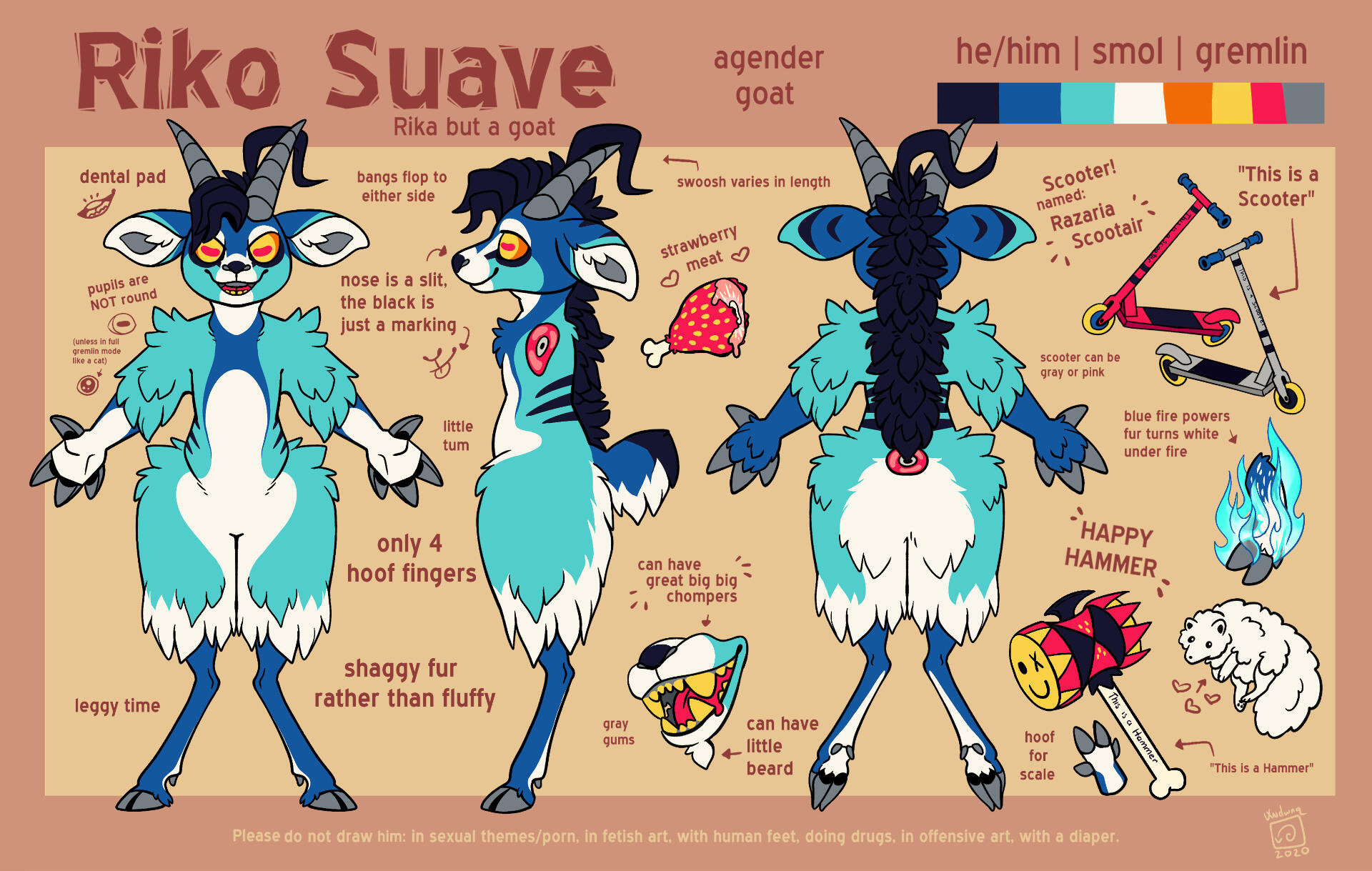 Drawing Dos: Please do draw him with his scooter/hammer/blue fire/strawberries/strawberry meat, with friends, punching bigots, in gore/candy gore art (within reason).