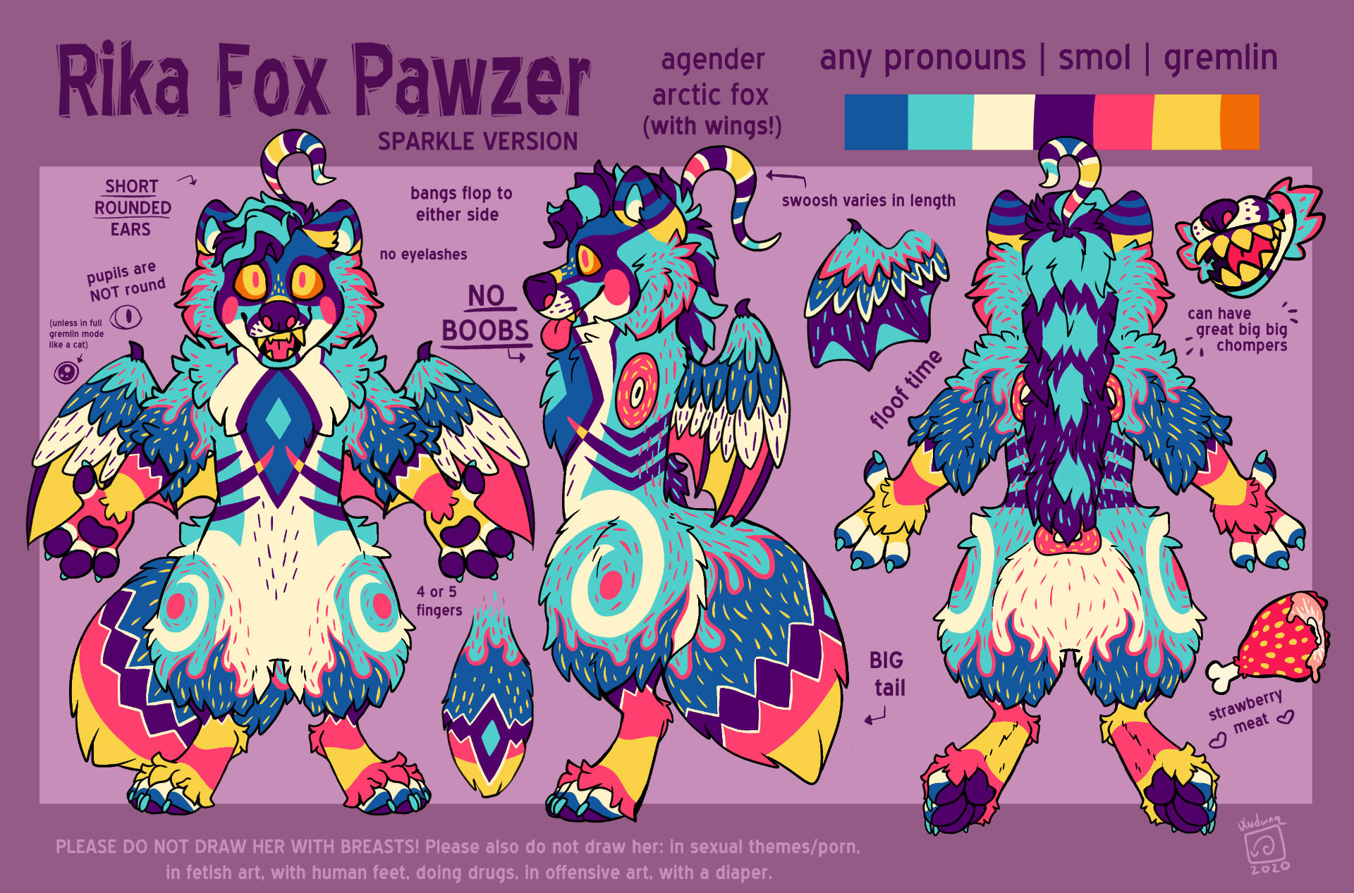 Sparkle Rika was created out of spite. Too often I see people online making fun of other people's sonas for crazy colors and designs (also known as Sparkledogs). Many jokes are made like "ah my eyes!" and the like, and honestly, it is not fun to experience. So in support of everyone who has characters exactly the way THEY want, with all the colors and patterns they feel comfortable with, I made Sparkle Rika! She is inspired by summer, fire, clowns, and her fave colors. Also wings were added for good measure!