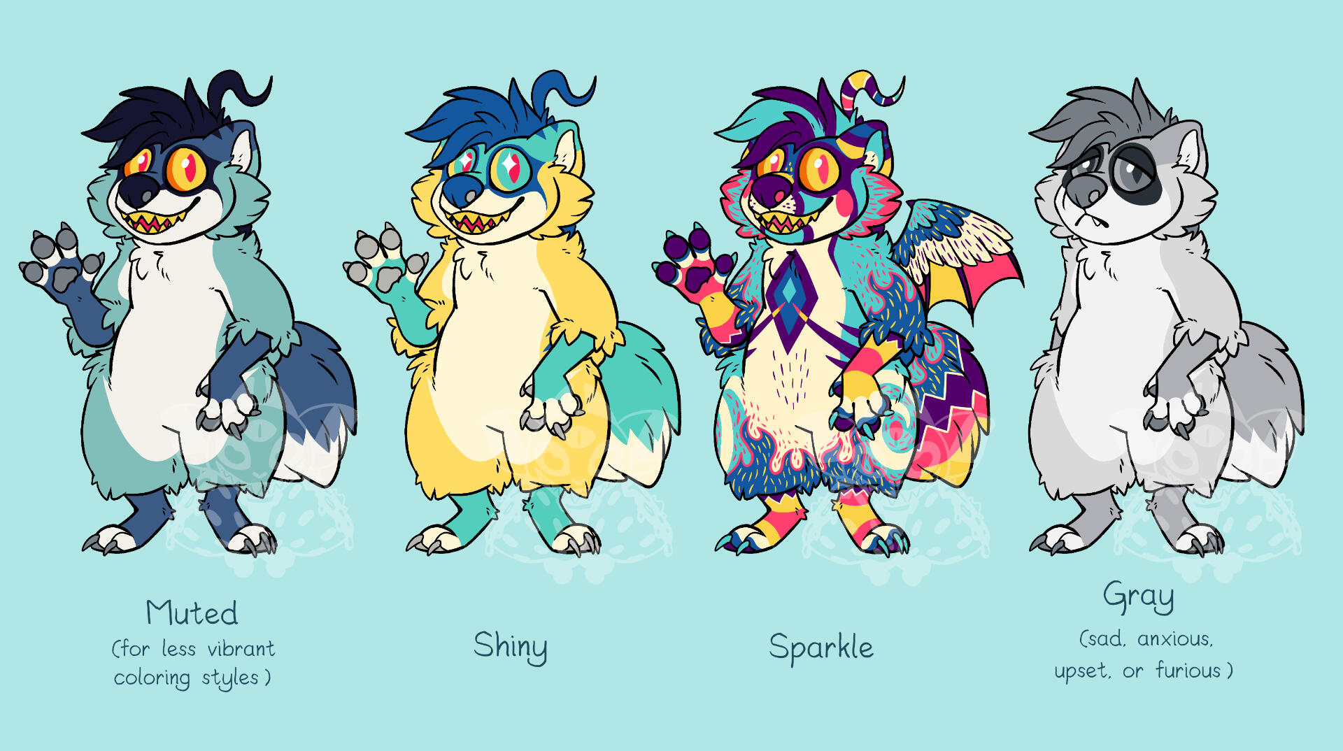Gray Rika is essentially her true form. When she was young, she was gray and felt lost. When she began to have confidence in herself, that turned her aqua! Sometimes tho, she can't keep up with her optimistic nature and her color and markings fade. Gray Rika is almost always depicted as sad, anxious, or angry. We don't like to see gray Rika, but we love her anyway!